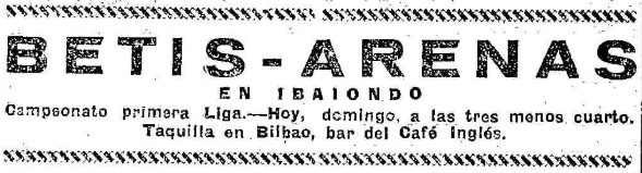 Imagen 1. Anuncio del partido Arenas-Betis que se disputaría en Ibaiondo el domingo 17 de diciembre de 1934 a las tres menos cuarto de la tarde. Excelcius. Biblioteca Digital Bizkaia.