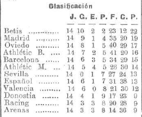 Imagen 3. Resultados y clasificación de la Liga 1934-35 tras 14 partidos disputados